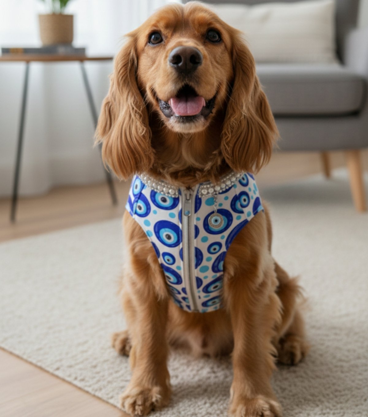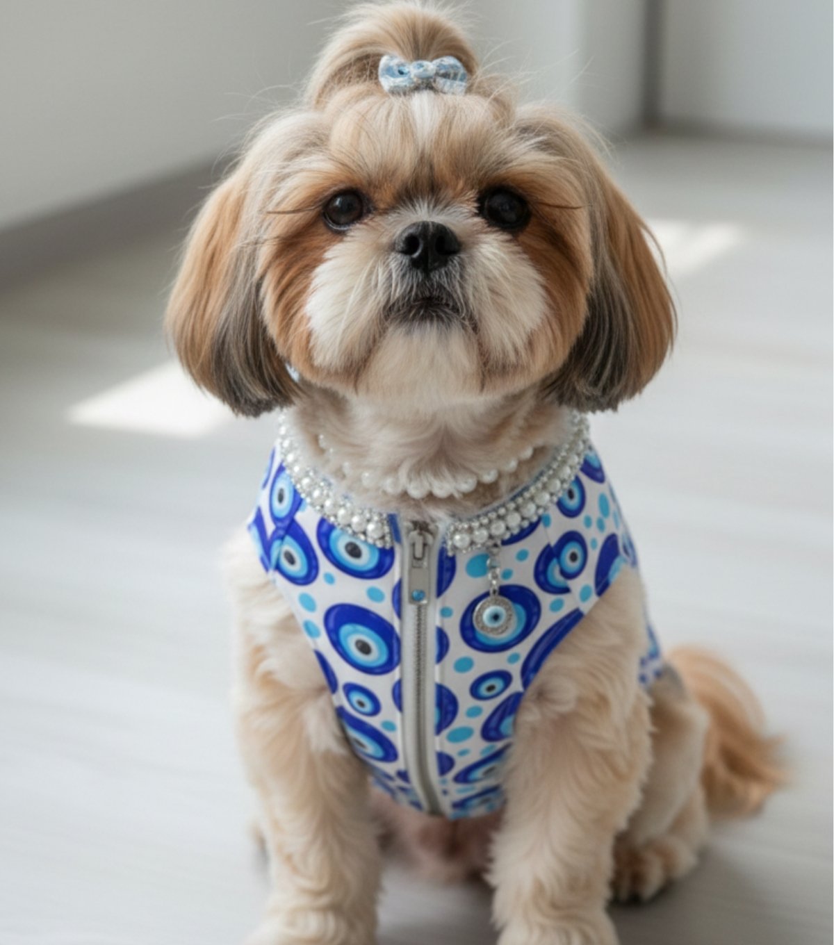 Designed with a convenient zip opening for easy wear, this stylish dog shirt is crafted from premium cotton fabric for all-day comfort. The elegant evil eye embellishment adds a touch of charm while enhancing the overall look—perfect for dogs who love to stand out effortlessly.